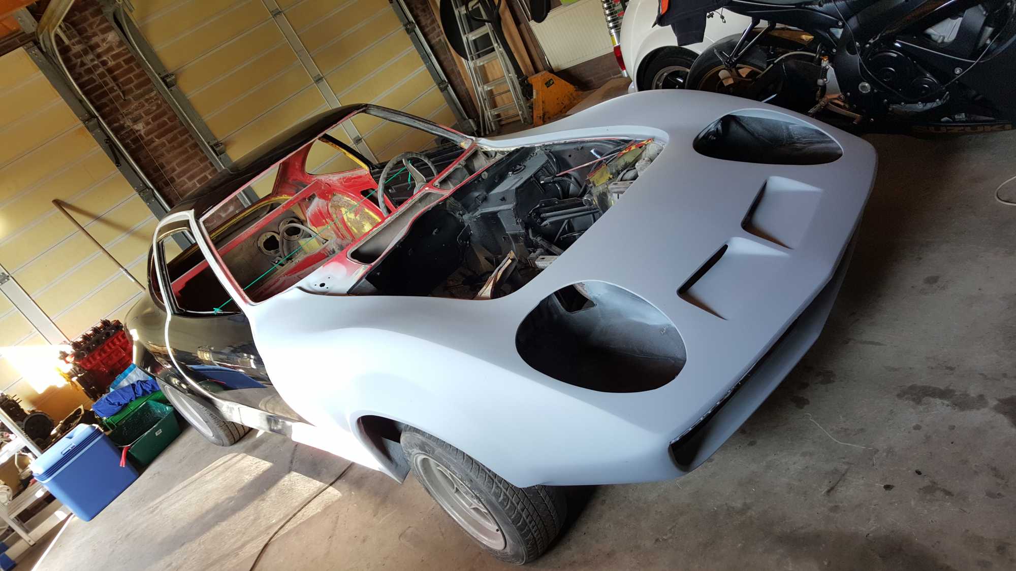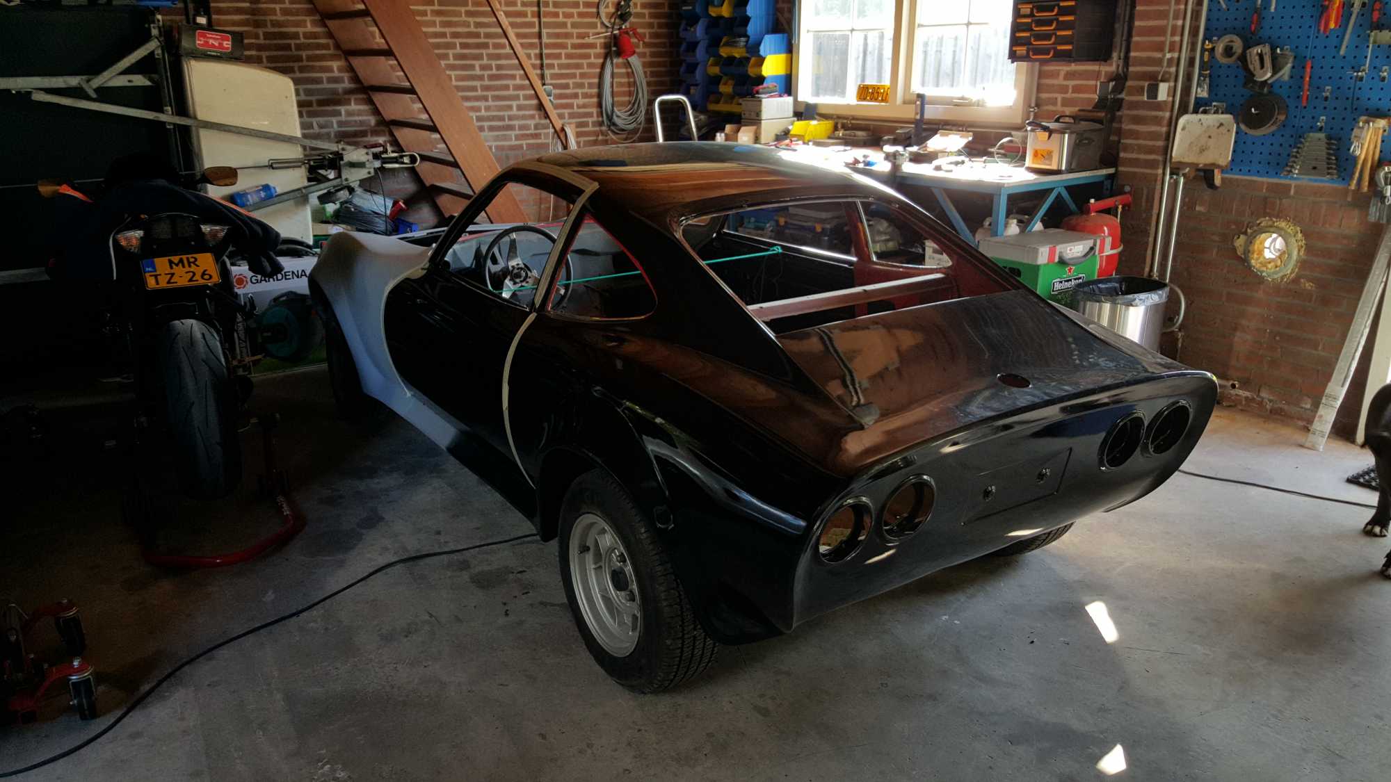 Staat op het moment aan de achterzijde (plus deuren en motorkap) in een laag hoogglans zwart (om oneffenheden te vinden) en de voorzijde staat in de epoxy primer!